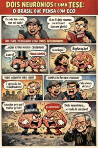 Entre um e outro, onde deveria haver pensamento, existe apenas um vazio constrangedor, um eco oco de frases ouvidas em podcasts, tweets, vídeos curtos, palestras de ocasião. É o reino da opinião reciclada, da ideia de segunda mão, do pensamento por procuração, do eco infinito. E é nesse deserto intelectual que floresce o fenômeno mais impressionante da vida pública brasileira, a saber, a capacidade infinita de reduzir o mundo a uma disputa de condomínio ideológico.