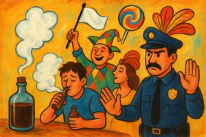 A maior concessão feminina era a presença de uma madrinha, uma espécie de Nossa Senhora dos Pinguços. Ela desfilava, pulava, bebia, mas não cheirava loló. Era uma tutora moral e logística, cuidava de nós como uma galinha cuida dos pintinhos – só que os pintinhos estavam sempre bêbados, cambaleantes e, às vezes, voando com ajuda de loló. Além disso, a Madrinha tinha o cargo oficial de Comissária de Menores. Uma ironia de tal grandeza que faria até Kafka desistir da literatura para vender dindim.