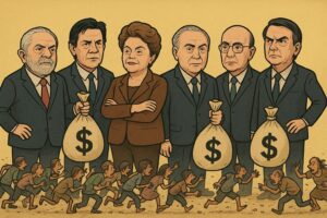 Usina de paradoxos, o Brasil investe como rico e entrega como pobre. Gasta 6% do PIB em educação, acima da média da OCDE, mas ostenta resultados de submundo. No Pisa de 2018, ficamos em 57º em leitura e em 66º em matemática. É como pagar champanhe francês e receber cachaça de garrafão. A cada governo — Lula, Dilma, Temer, Bolsonaro e Lula outra vez — repetiu-se o mesmo espetáculo: a educação foi tratada como discurso de palanque, enquanto a prioridade real era outra. Não formar cidadãos, mas fabricar dependentes.